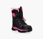 Easy pull-on nylon winter boot with hook and loop strap closure at top line and decorative stretch lace/toggle. Bellows tongue. Removable molded foam footbed. Thermoplastic rubber outsole.