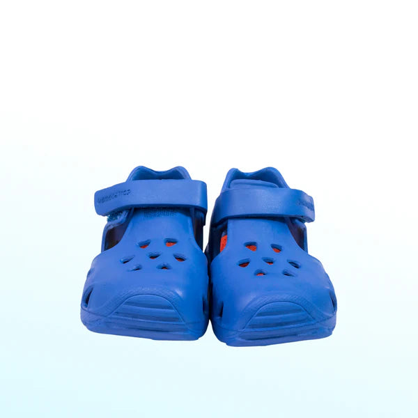 These shoes are designed for young children, featuring a closed-toe design with ventilation holes for breathability, a secure Velcro strap for easy fastening, and a flexible sole for comfort. EVA material is lightweight and water-friendly, what makes them suitable for both indoor and outdoor use, especially in warm weather or near water.