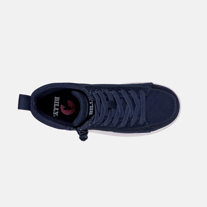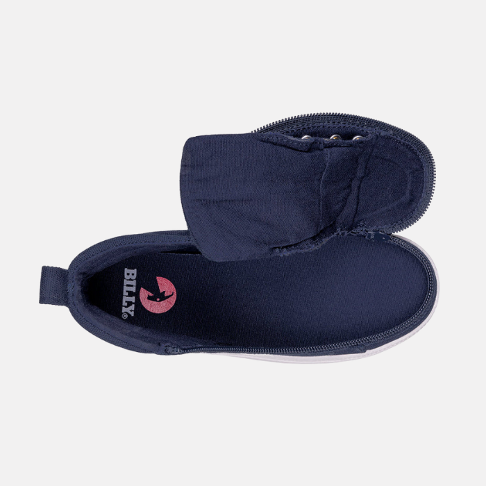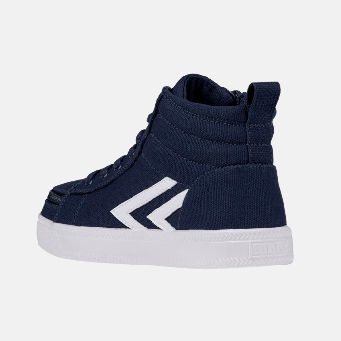 Inspired by a core-skate look, the Navy/White BILLY CS Sneaker High Tops are sure to deliver. These trending kicks embrace nostalgia yet remain true to current style. Coming with functional laces for a custom fit, removable insoles for added depth, and a wraparound zipper for unmatched convenience, your kiddo is going to feel good when they Step In!