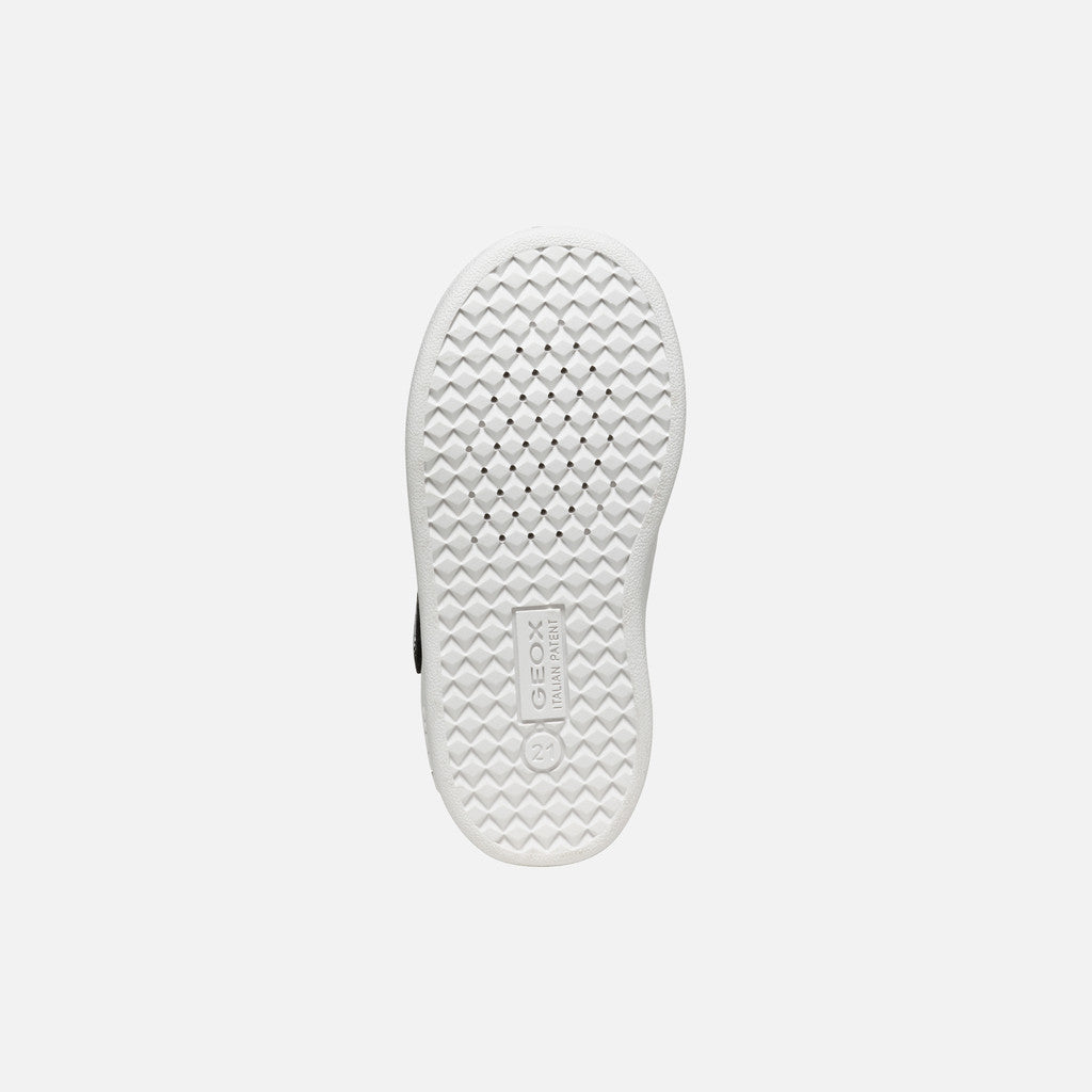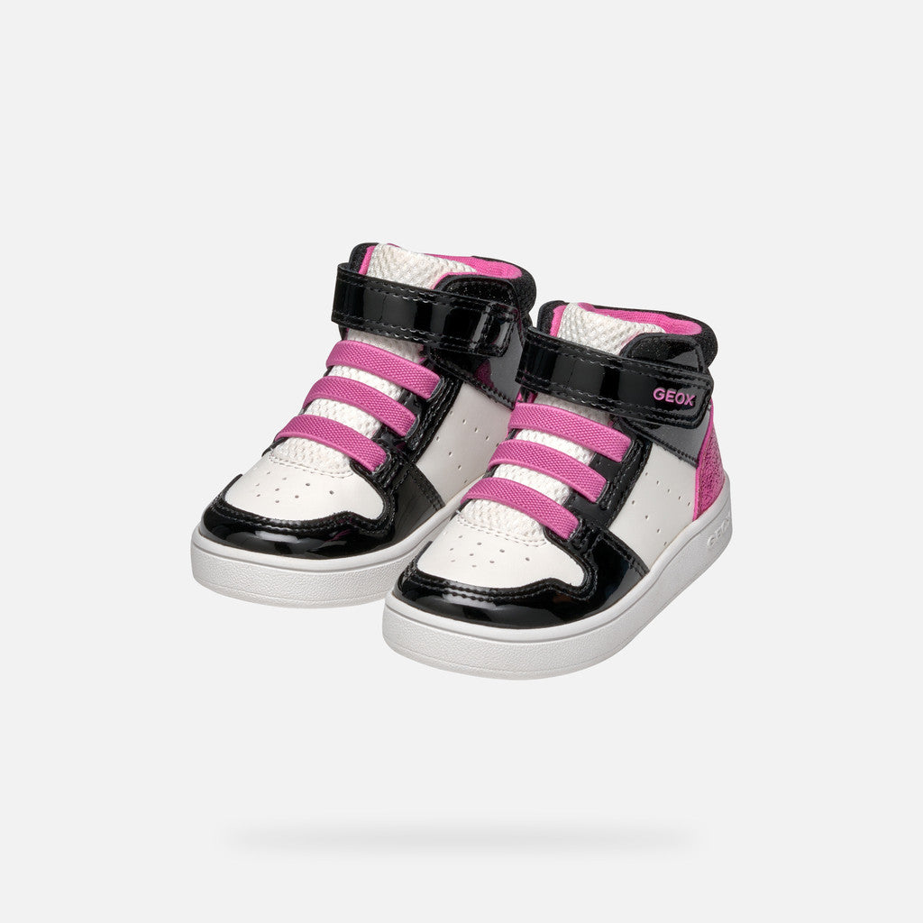 Mid-cut sneaker for babies with a basketball-style double hook-and-loop closure and a sporty contemporary aesthetic. Cast in white with contrasting black details, Eclyper is an essential part of any casual everyday wardrobe. It has been crafted from a leather-effect material and glittery patent leather and will be the perfect way to brighten little outfits.