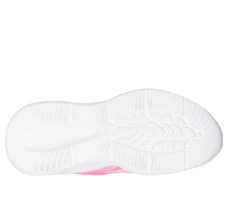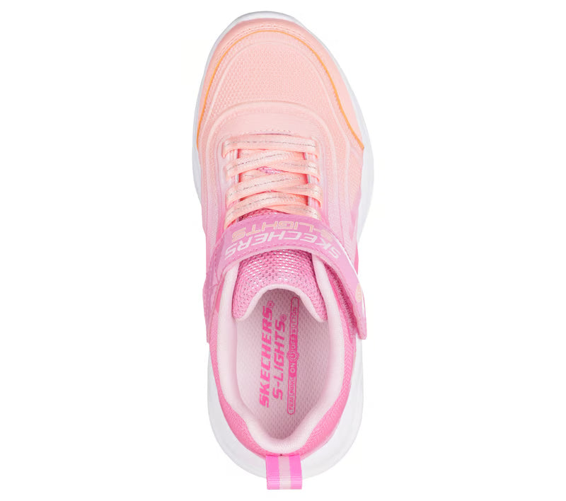 Sparkle and shine in magical delight wearing Skechers Heart Lights® - Lovin Reflection. This light-up design features a mesh upper with synthetic overlays, an adjustable instep strap closure, and a sculpted light-up midsole with 'heart chain' detail.