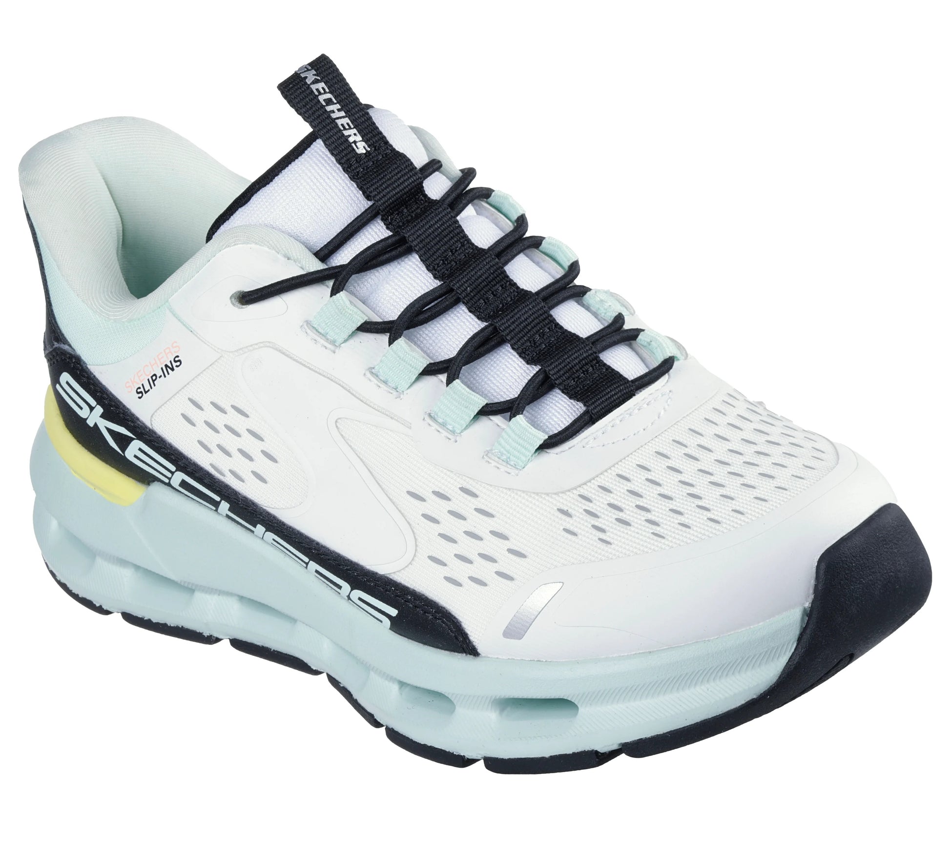 Play all day with added comfort in Skechers Hands Free Slip-ins®: Glide-Step® + - Vista Lane. Designed with our exclusive Heel Pillow™, this sporty slip-on features a mesh and synthetic upper with stretch laces, a cushioned Glide-Step® geometric midsole, and a Skechers Air-Cooled Memory Foam® insole.