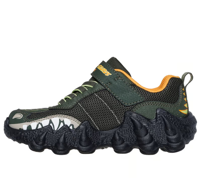 Stomp in roar-some fun and comfort wearing Skechers Skech-O-Saurus Light 2.0. This light-up dinosaur theme design features a reptilian style mesh and synthetic upper with stretch laces, Skechers adaptive closure and a T-Rex claw midsole.