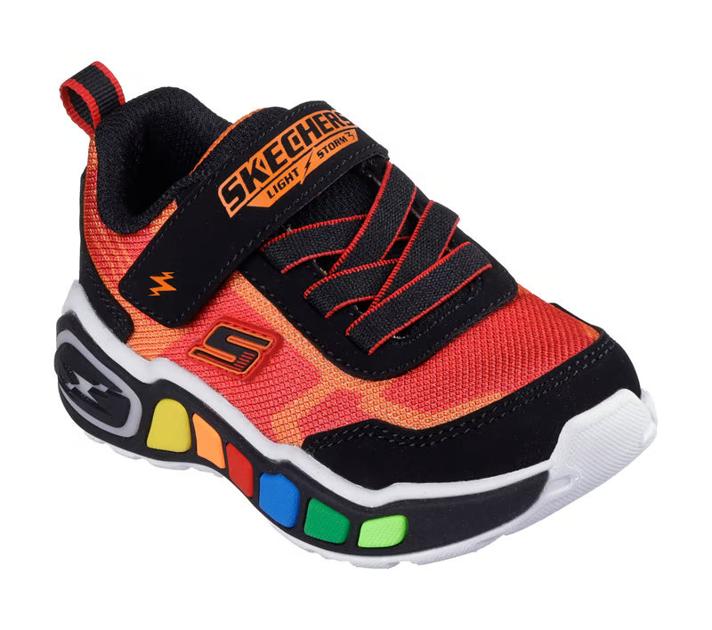 Be the fun in colorful light-up style wearing Skechers Play Scene - Storm Brights. This sporty light-up design features a mesh and synthetic upper with stretch laces, adjustable instep strap, cushioned comfort insole, and a multi-colored light-up midsole tech piece.